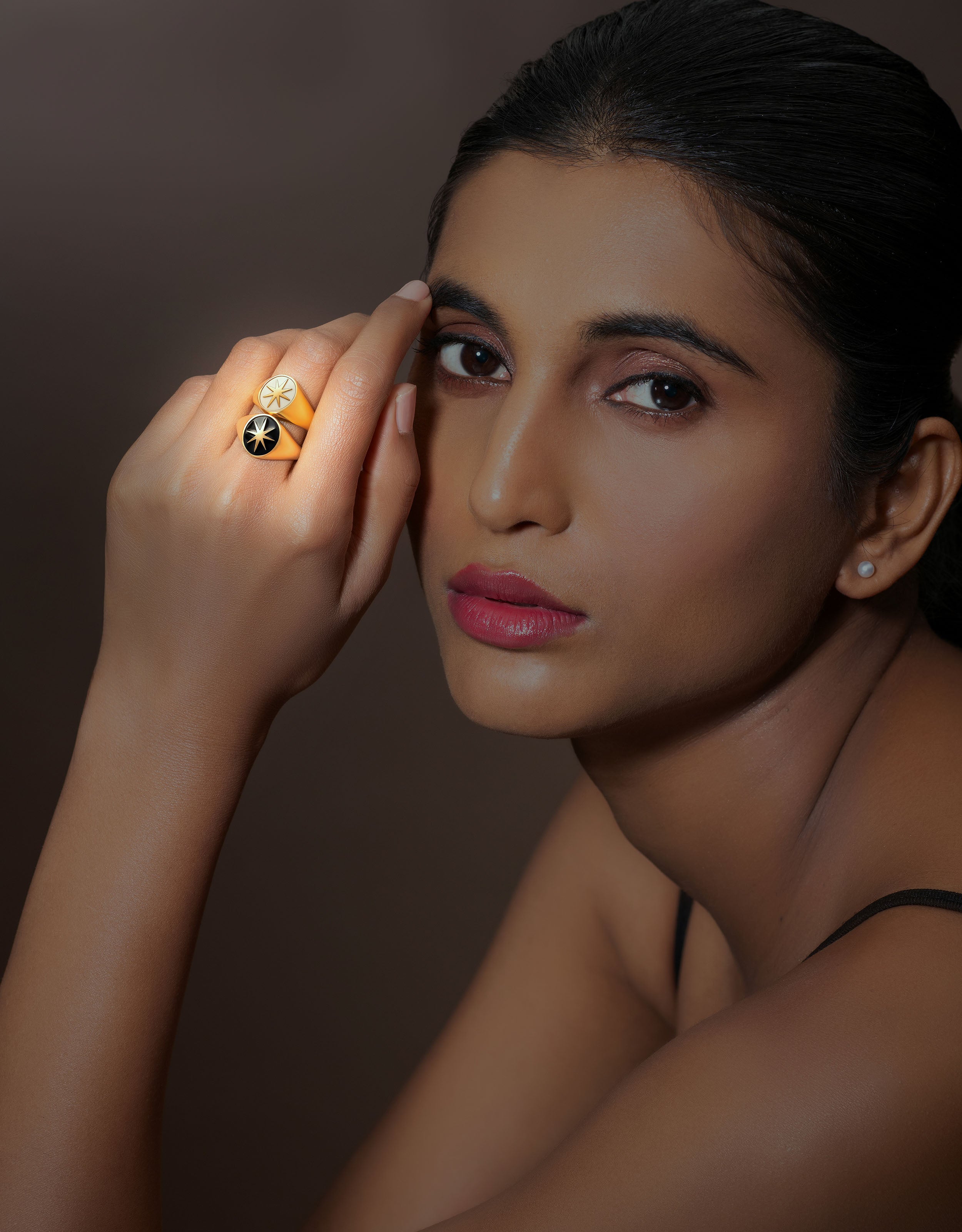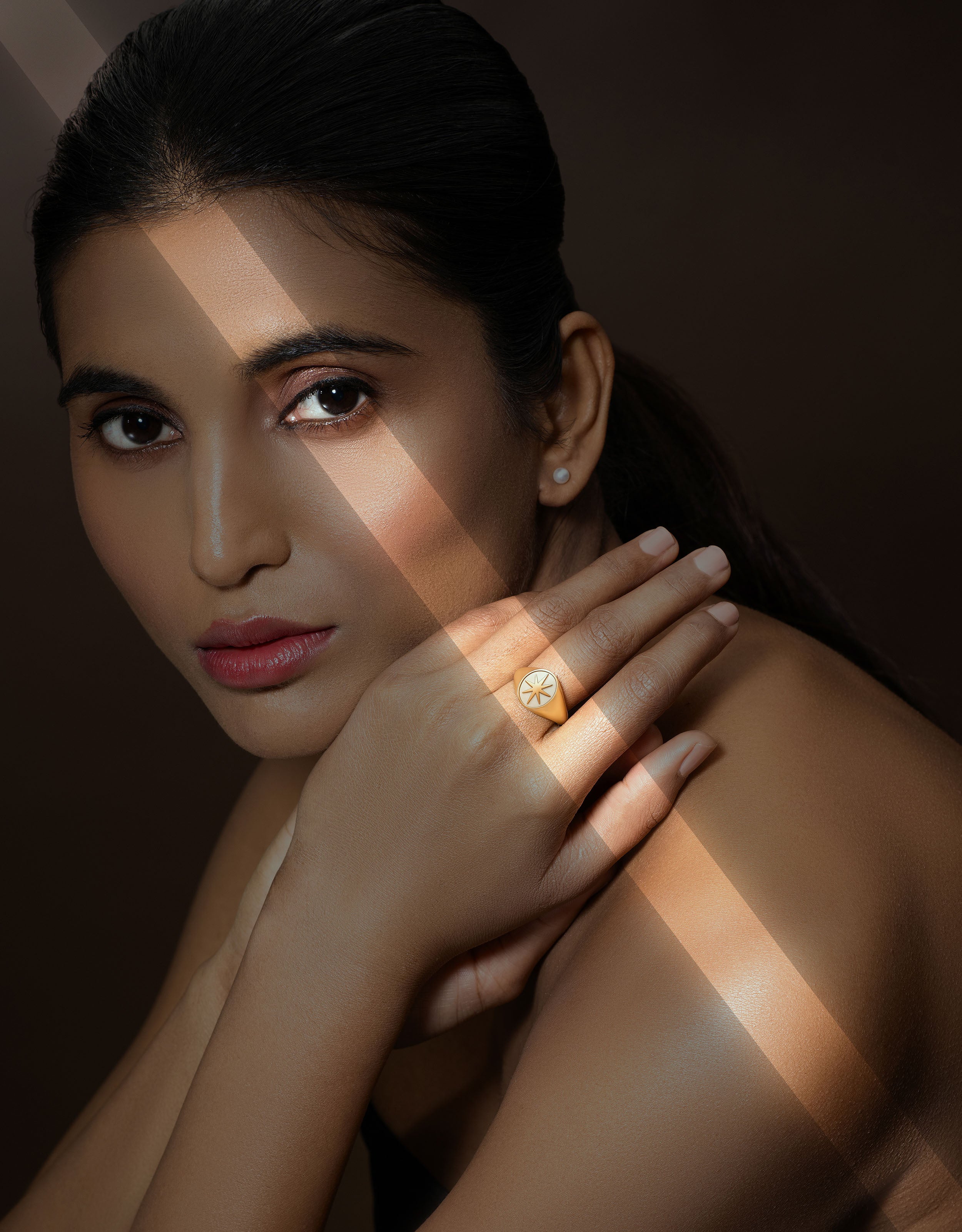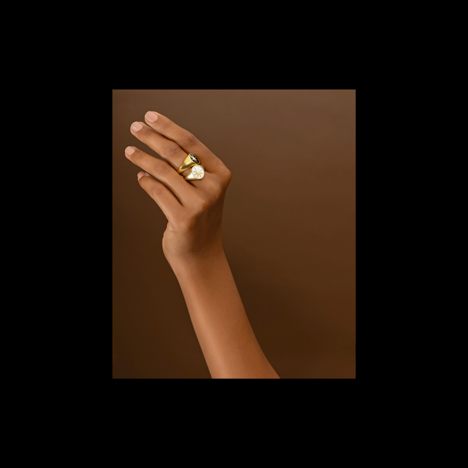A tribute to radiant winter mornings, the Aurum Astra Signet captures quiet luxury in its purest form. A clean oval silhouette in mirror-polished gold frames, lustrous ivory enamel, crowned with a refined star motif. Designed to sit low and glide effortlessly beneath cuffs, it whispers elegance with every gesture.